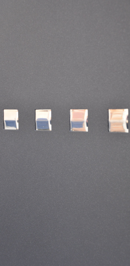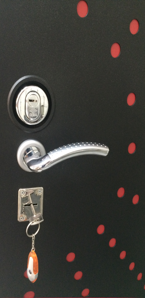 Это ещё один вариант нестандартного оформления металлической двери: позволяя сделать нестандартный узор, перфорирование делает его из небольших элементов прямоугольной и круглой формы.