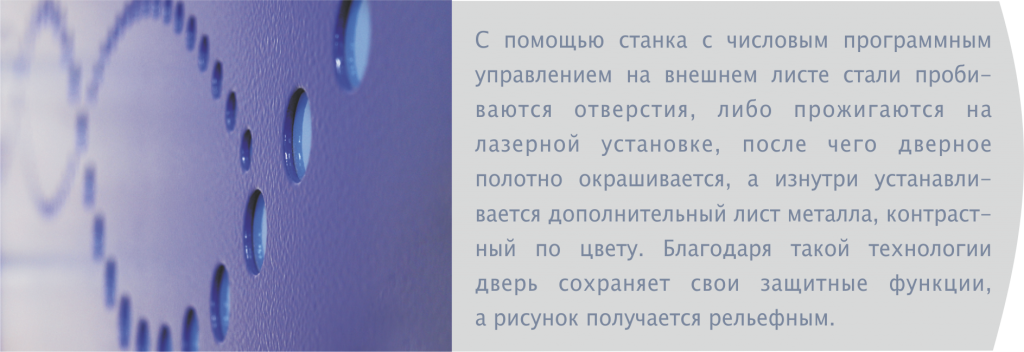 Отверстия в листе пробиваются при помощи  станка с ЧПУ. После этого дверное полотно окрашивается в один цвет, а внутрь устанавливается ещё один лист металла, окрашенный в другой цвет. Таким образом, сама дверь сохраняет свои качества, а рисунок становится ярким и рельефным.